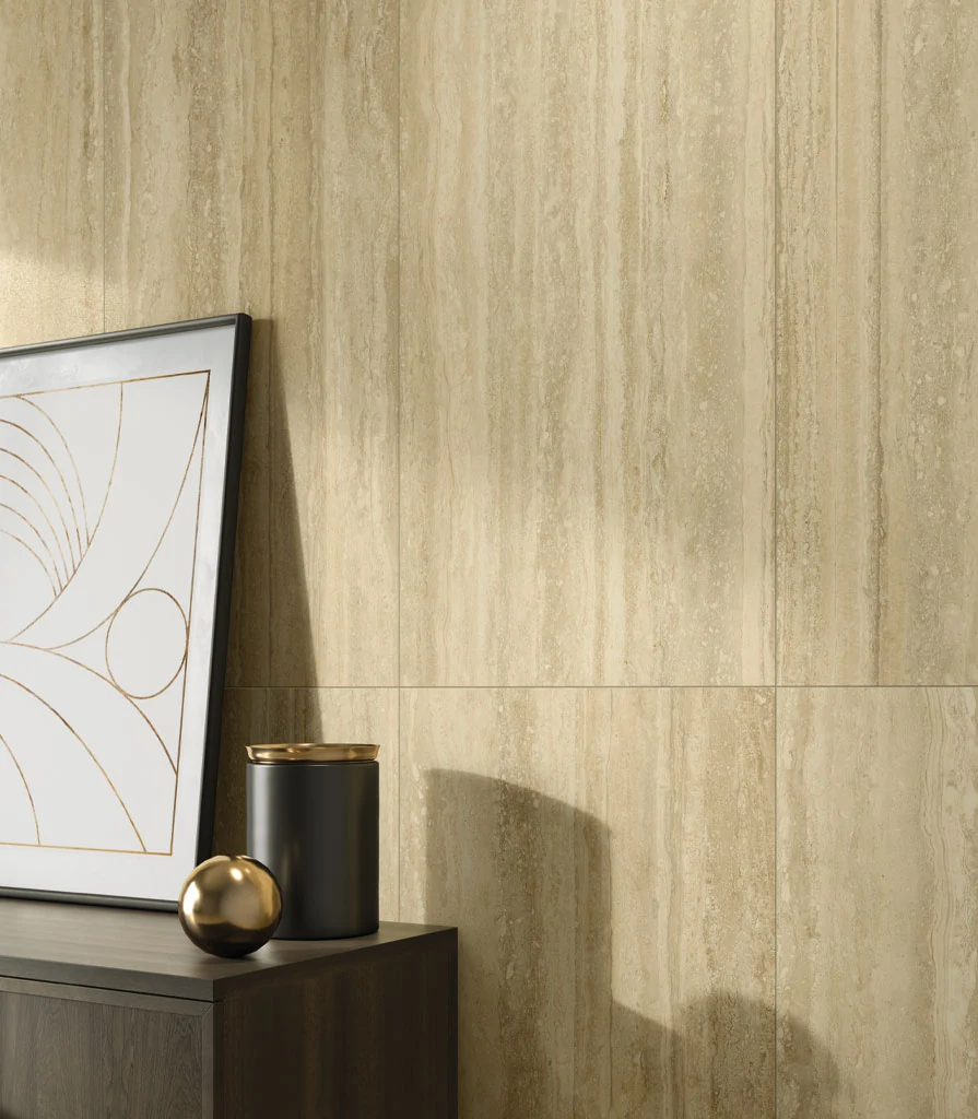 The cosy living room design is decorated with Travertino Romano beige porcelain stoneware in the 80x160 format on the floor and the 60x120 format on the walls. The famous travertine graphic on a soft, smoky background fills the space with harmony and tranquillity. The subtle, weightless stringers, echoing the motifs of the natural material, embody the true identity and authentic character of the living room interior. The accent wall, decorated with Play Gold wall decoration with gold elements in the 30x30 format, highlights the elegance of the space.