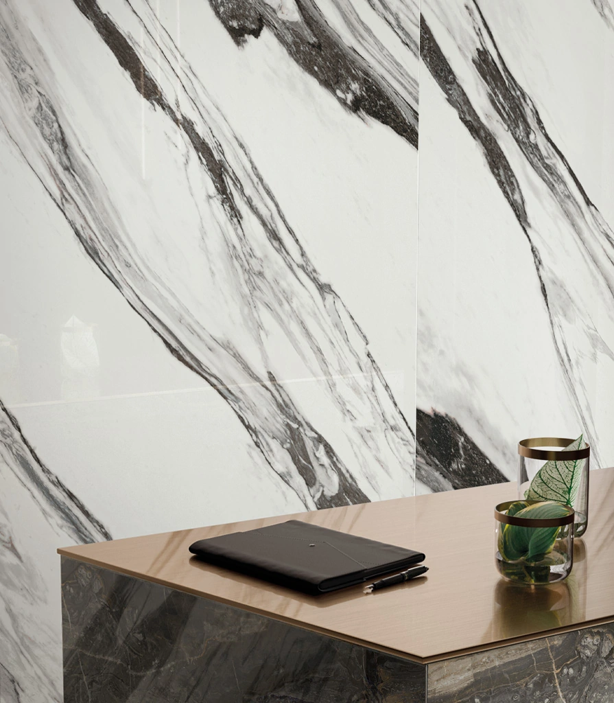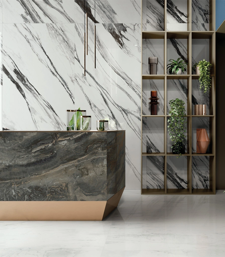The lobby interior uses large-format marble look tiles for the floor, walls and reception desk. The interweaving of stringers of different shapes and shades creates an unusual contrast in the space. By combining Grigio Orobico, Bianco Michelangelo, Statuario Fantastico and Sahara Noir marble look porcelain stoneware tiles, you can create a practical design for an entrance or waiting areas that fascinates at first glance.