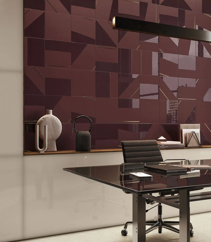 The range of decors is completed with 3 solutions for walls. The brand new Elegant mosaic in two colour versions: Calacatta Gold and Royal Ivory, both with gold inserts. Vertex, the precious, high visual impact mosaic, is ideal for designer bathrooms and available in two dark variants: Arcadia Brown and Imperial Black. The Play tiles, in Petrol, Denim or Wine colours on the other hand are suitable for niches, or to add a touch of colour to commercial settings. 6 faces with matt and glossy textures for high quality reflections.