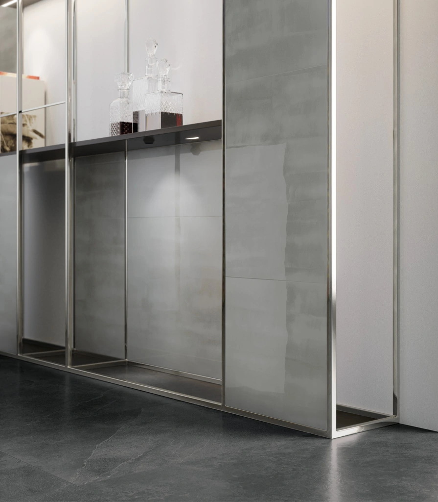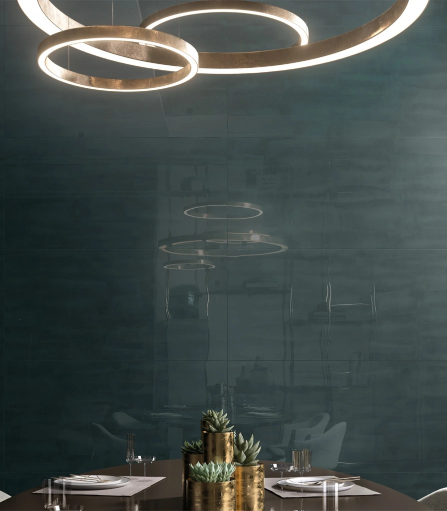 Uno stile che gioca sui riflessi e sulla continuità compositiva per un living ultra-contemporaneo. L’uso dei grandi formati a pavimento e rivestimento dona un senso di spazialità all’ambiente, mentre il design si fa accattivante con la contaminazione fra finitura cerata ed effetto vetro della serie Surface. La collezione Materia di Italon è progettata per esaltare le più innovative potenzialità estetiche del gres porcellanato e per supportare le idee del design contemporaneo.