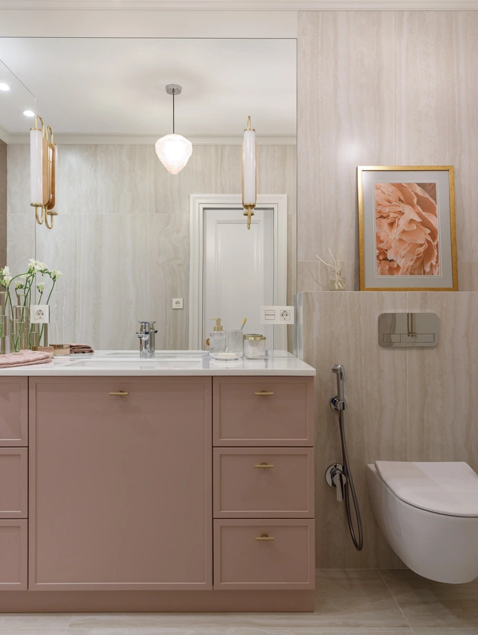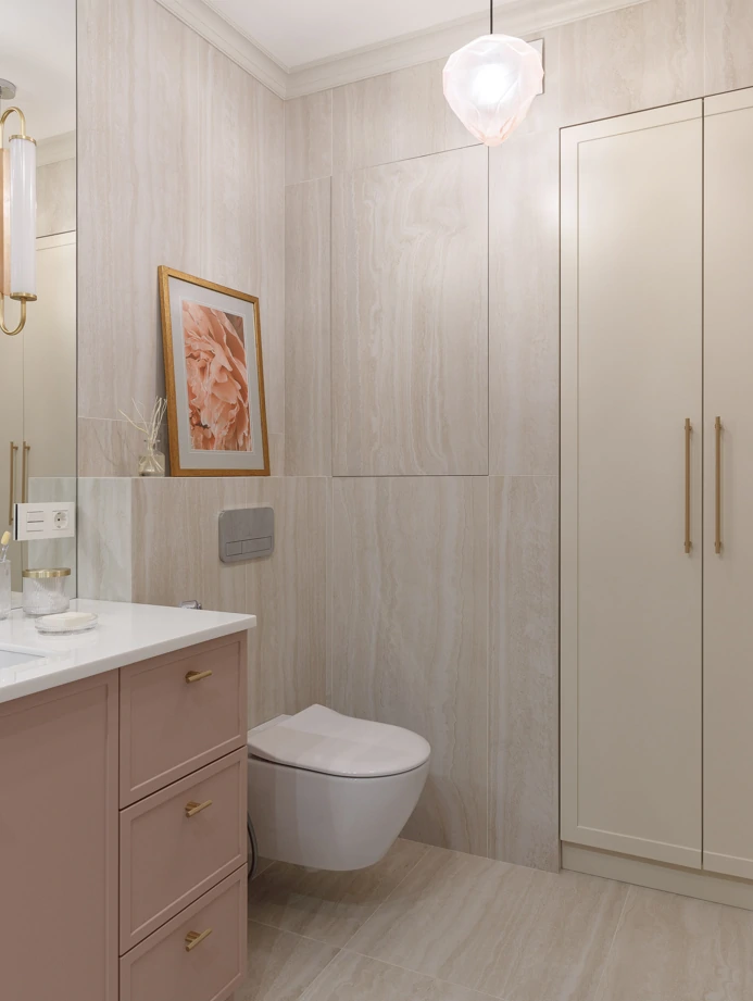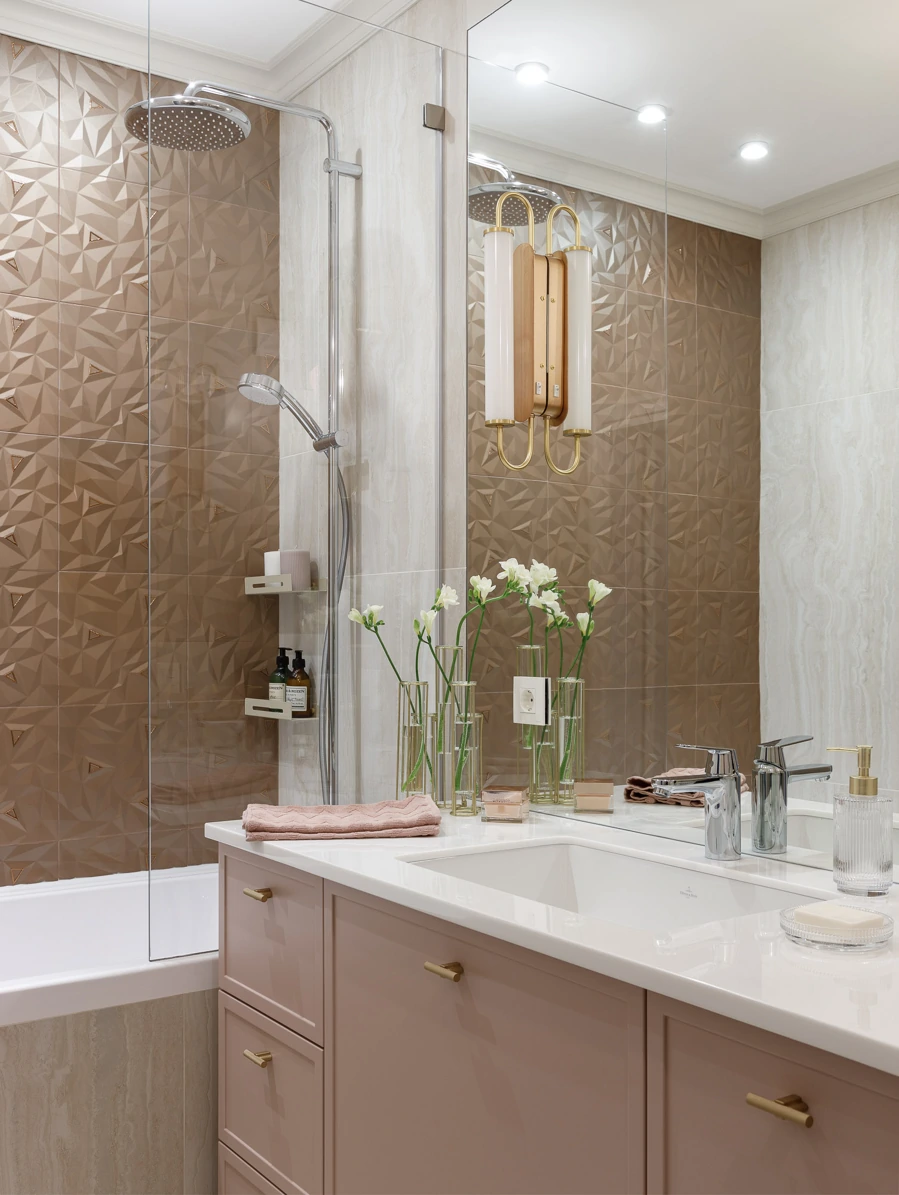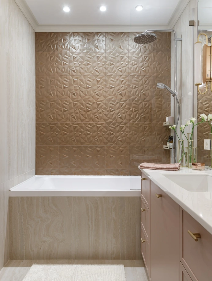 Il punto focale è la parete sopra la vasca da bagno, decorata con Play Gold 30x30. Gli elementi tridimensionali interagiscono elegantemente con la piastrella di fondo, combinandosi armoniosamente con i mobili, l'illuminazione e gli altri elementi. L'attenzione ai dettagli sottolinea il concetto di design ben ponderato.