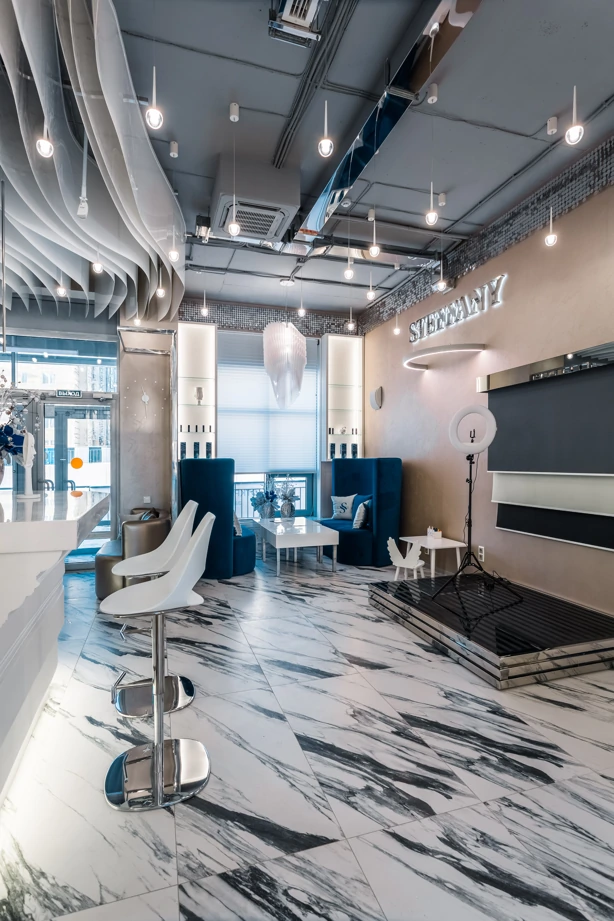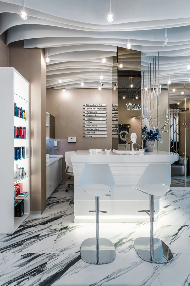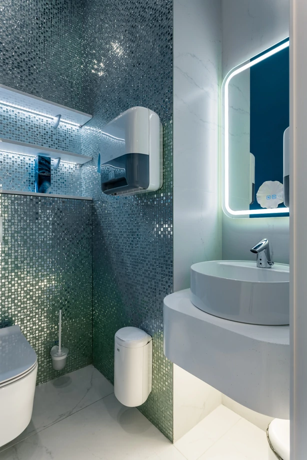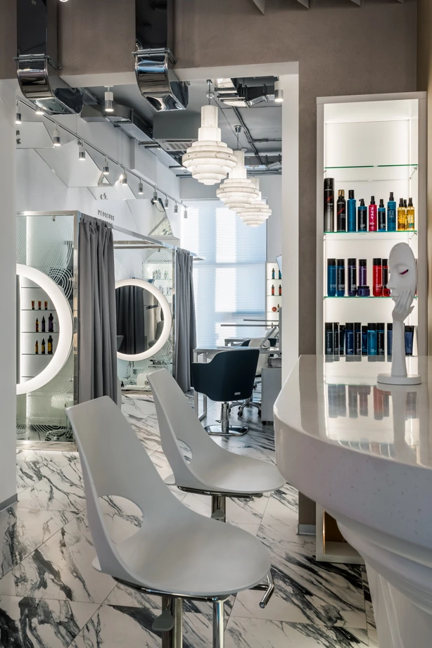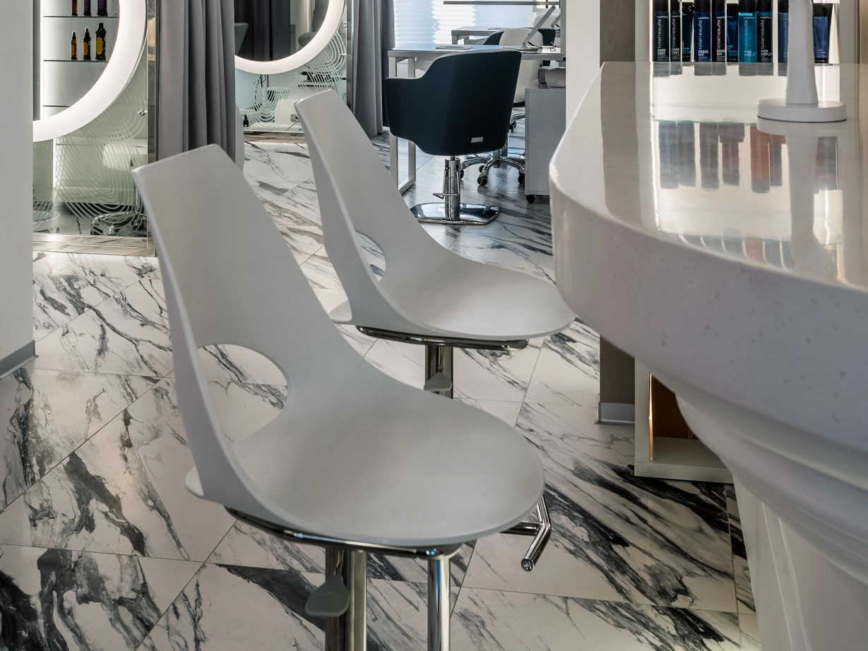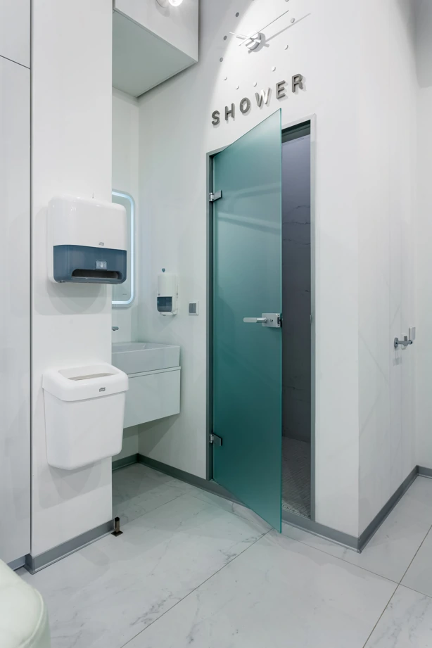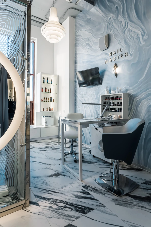 L’ufficio dell’estetista è stato progettato per trasmettere un’atmosfera di tranquillità, utilizzando piastrelle effetto marmo bianche come la neve con venature appena percettibili, Bianco Michelangelo 60×120 in finitura cerata. La zona delle docce presenta due tipi di mosaici: Strip Michelangelo 26×75 sulle pareti e Split Michelangelo 30×30 per la pavimentazione; le fughe servono da antiscivolo, garantendo la sicurezza degli ospiti.