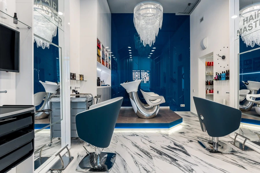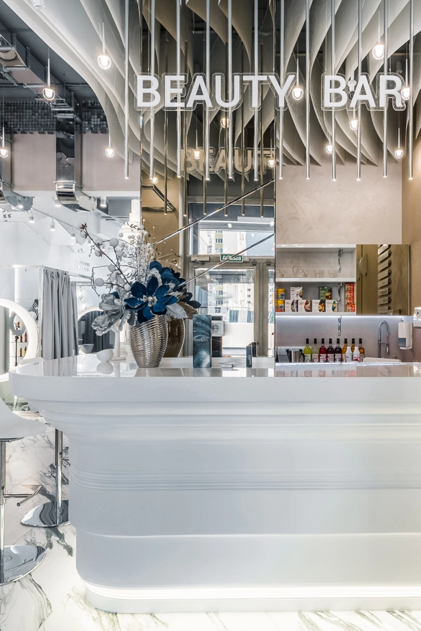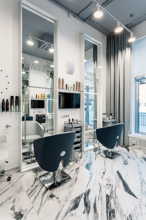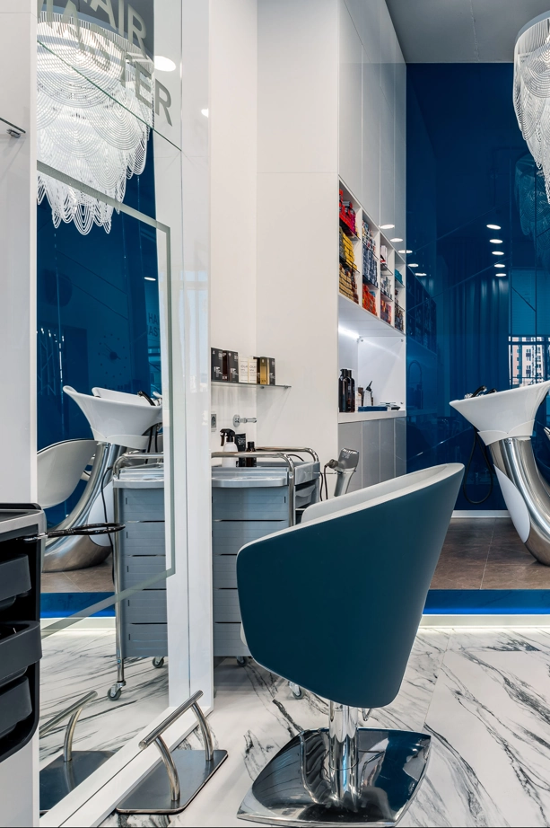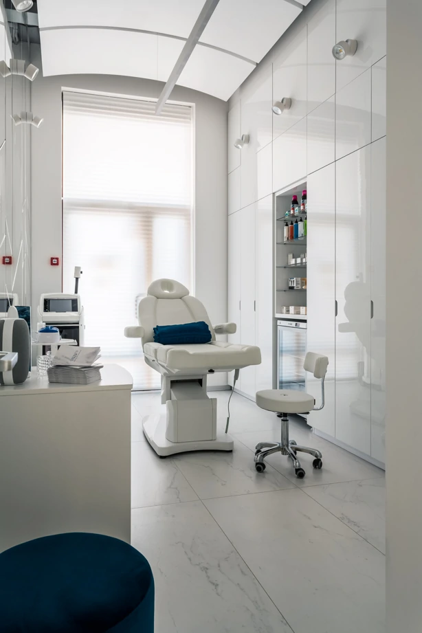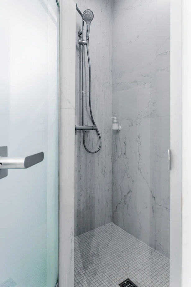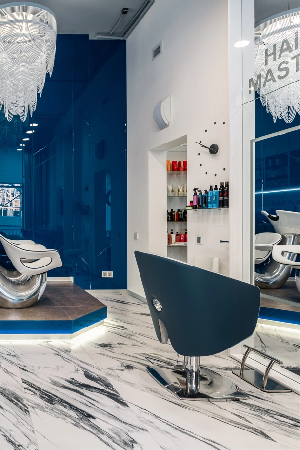 L’ufficio dell’estetista è stato progettato per trasmettere un’atmosfera di tranquillità, utilizzando piastrelle effetto marmo bianche come la neve con venature appena percettibili, Bianco Michelangelo 60×120 in finitura cerata. La zona delle docce presenta due tipi di mosaici: Strip Michelangelo 26×75 sulle pareti e Split Michelangelo 30×30 per la pavimentazione; le fughe servono da antiscivolo, garantendo la sicurezza degli ospiti.