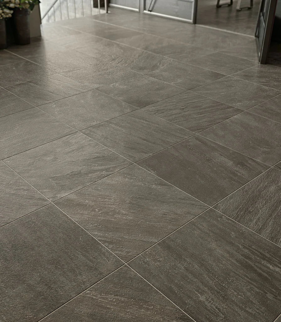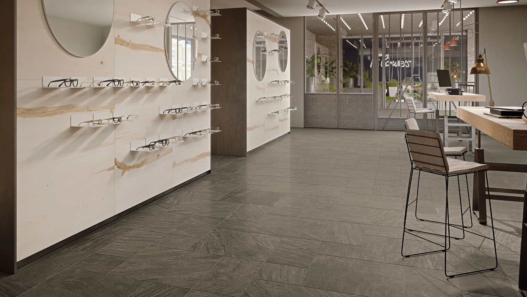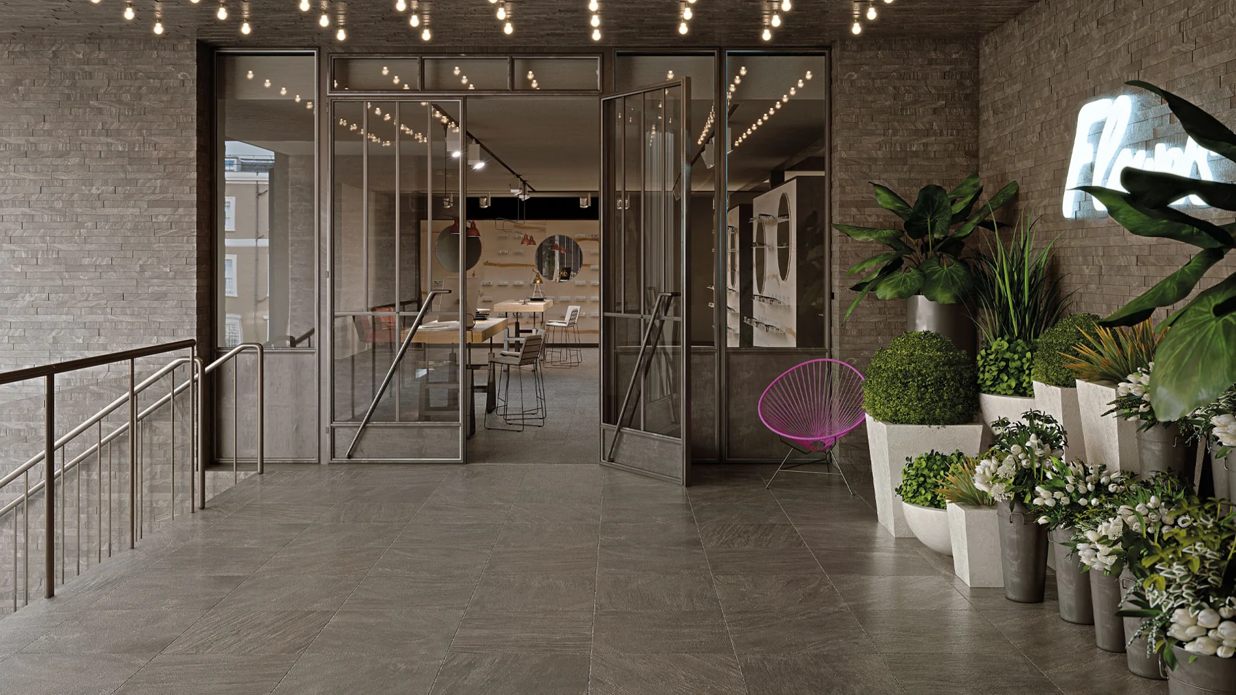 Брутальный интерьер шоурума создан с акцентом на природные текстуры. Темно-коричневый керамогранит под камень в цвете Графит стал главным элементом дизайна. Комбинация разных форматов – 60x60, 30x60 и 30x30 – позволила создать гармоничный геометрический узор на полу в выставочном пространстве. Во входной зоне на полу уложен стандартный формат 60х60, но тут сделали акцент на стене: трехмерный декор Графит Брик 3D с выступающими на разной высоте бриками максимально реалистично воспроизводит эффект натурального камня в интерьере. Эффектным дополнением стал керамогранит под дерево Элемент Ачеро 60X120 на стене.