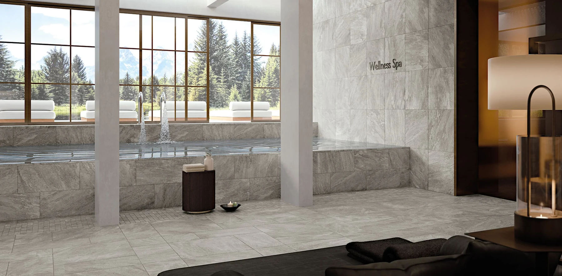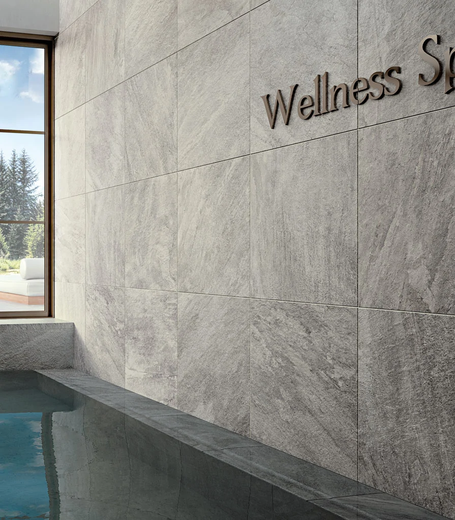 В спа-пространстве ключевую роль играют отделочные материалы. Они должны быть максимально натуральными и практичными. Серый керамогранит под камень, вдохновленный миром кварцитов, помог создать нужную атмосферу для отдыха и расслабления. Цвет Рок в мультиформатной укладке - 60x60, 30x60 и 30x30 – выглядит очень естественно и придает интерьеру современный характер. Использование противоскользящей поверхности «грип» в местах, где присутствует вода, гарантирует безопасное нахождение в спа. Специальные элементы – ступени, бортики и решетки – позволили решить все технические задачи проекта.