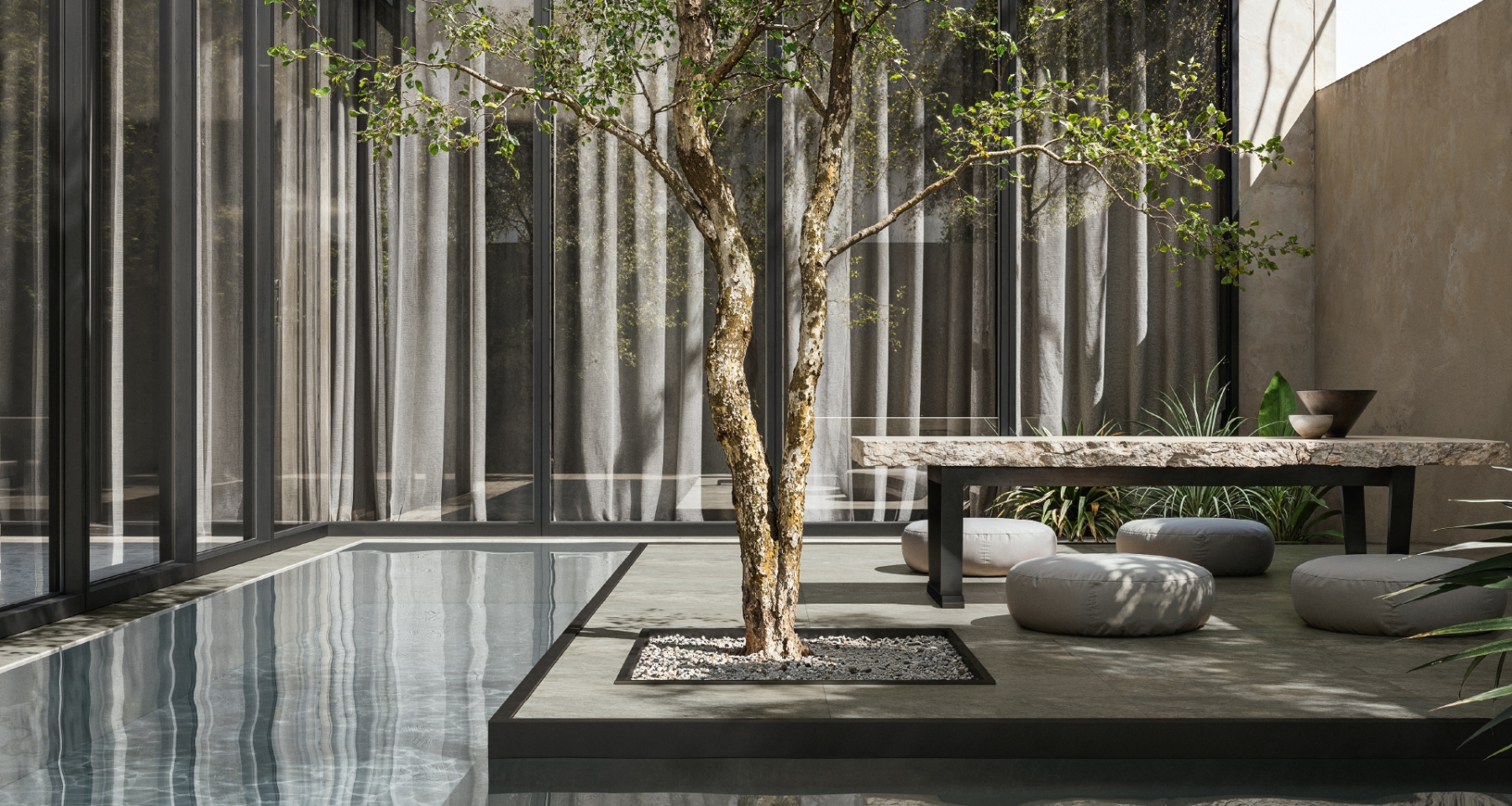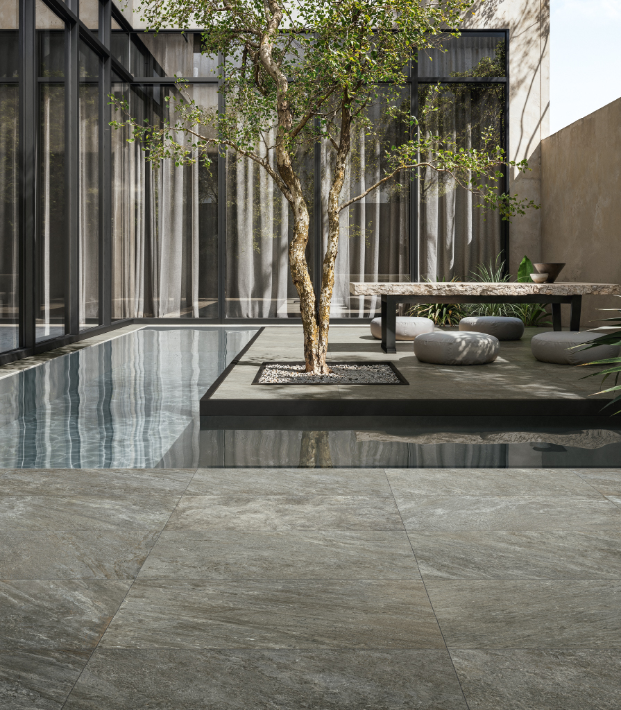 Дизайн двора с небольшим бассейном, зелёными насаждениями и уличной плиткой под кварцит. Идеальное место для отдыха и приватности в современном доме.