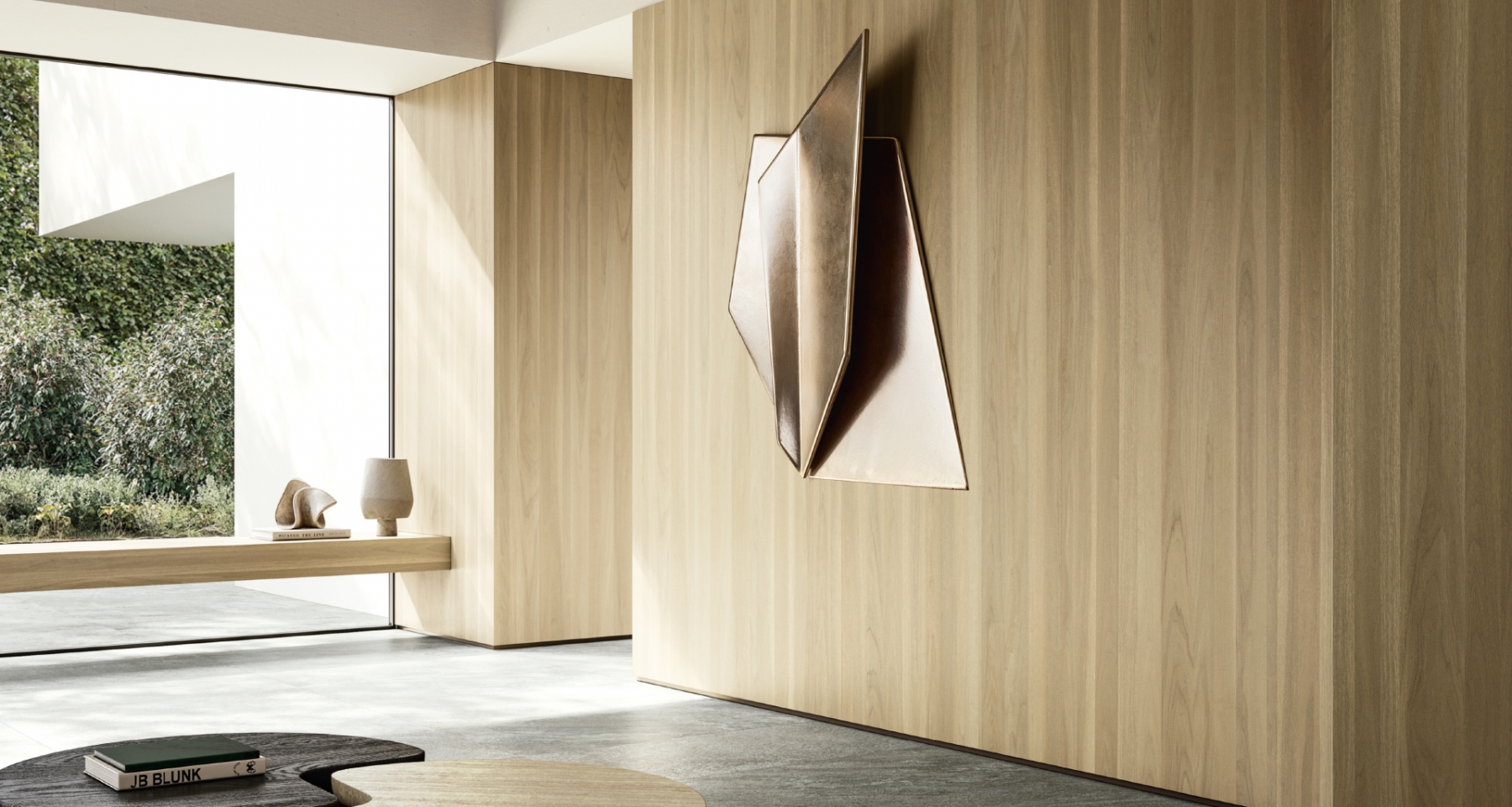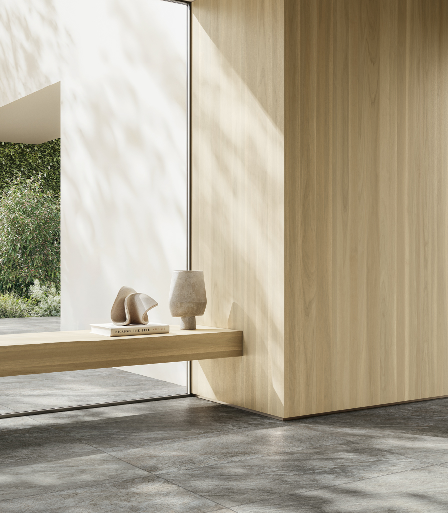 Минималистичная гостиная с природными фактурами и светлым керамогранитом — идеальное решение для современных интерьеров в стиле эко или сканди.
