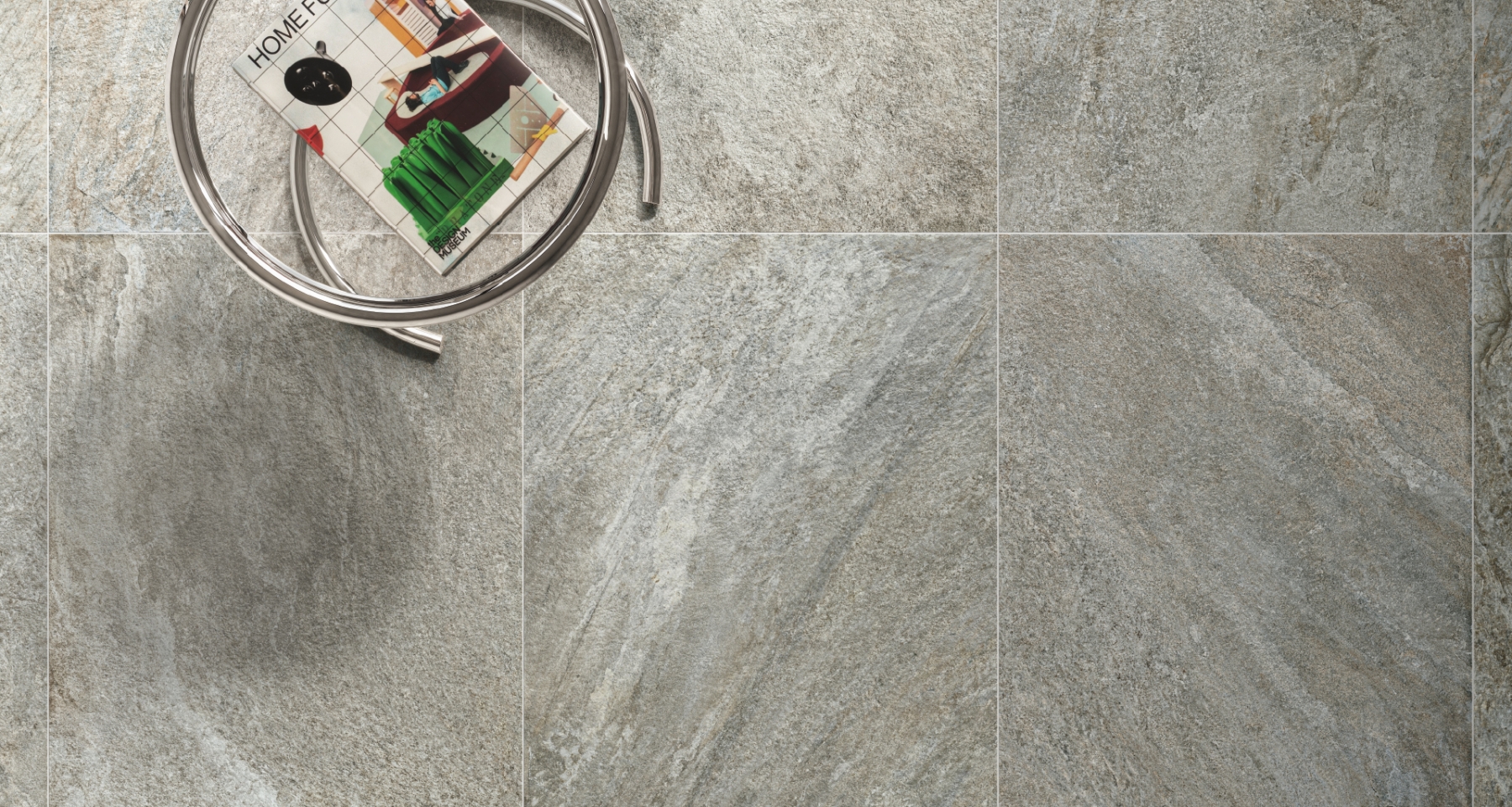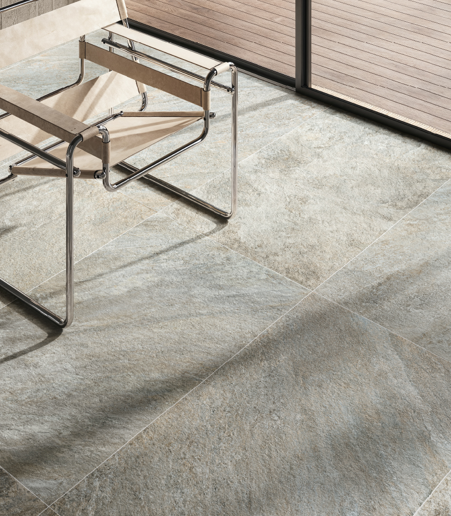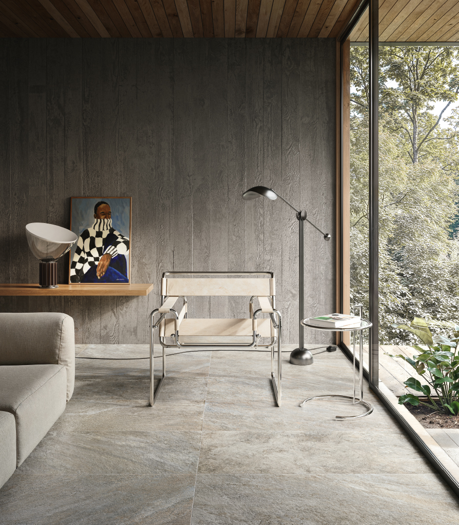 Современная гостиная с элементами минимализма и графики: керамогранит под камень в цвете Сильвер подчеркивает чистоту линий и арт-акценты в интерьере.