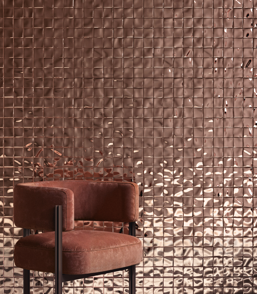 Интерьер ресторана в современном стиле: зеркальная мозаика цвета меди Мэджик Купрум, уютная посадочная зона и керамогранит под кварцит на полу создают эксклюзивную атмосферу и подчеркивают стильный облик общественного пространства.