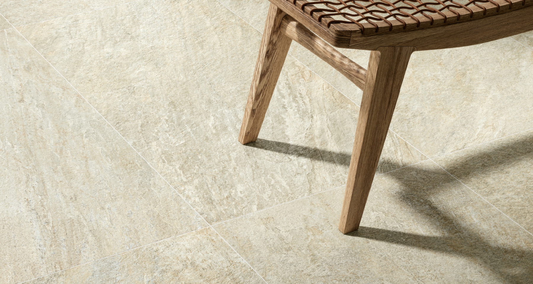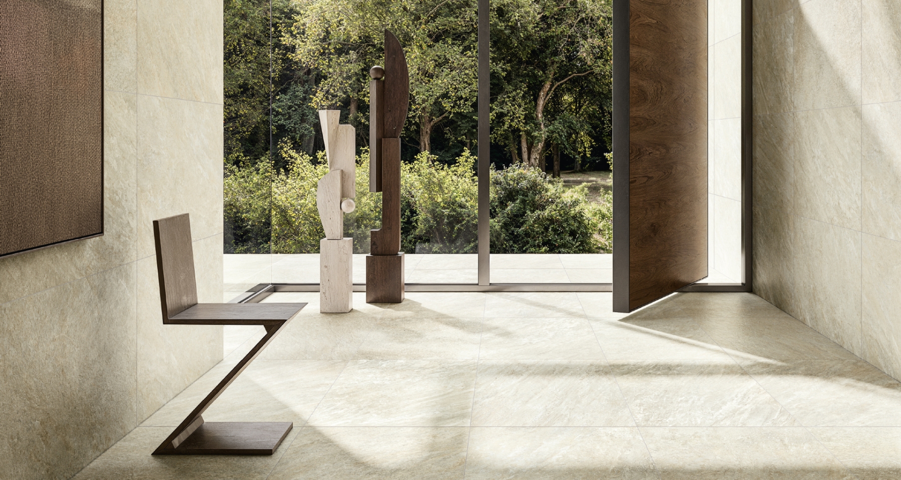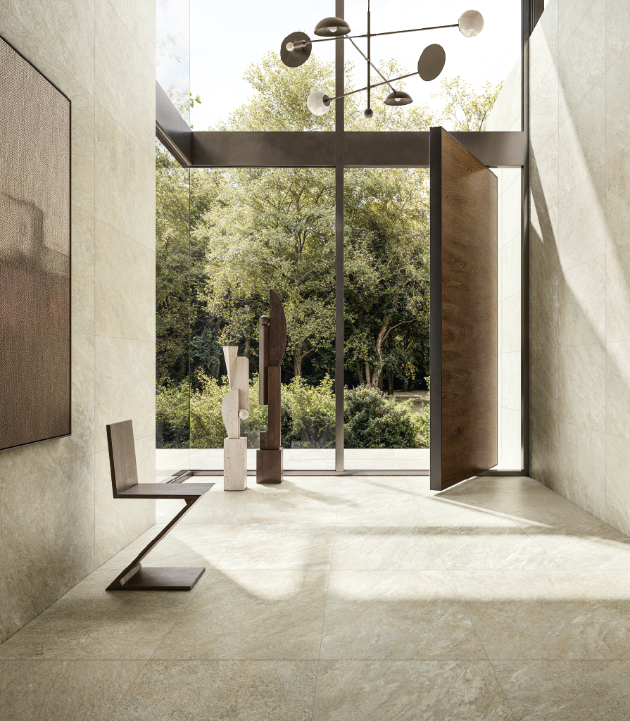 Светлый холл с огромными окнами: натуральные материалы и керамогранит под кварцит в цвете Минерал визуально расширяют пространство и делают интерьер по-настоящему современным.