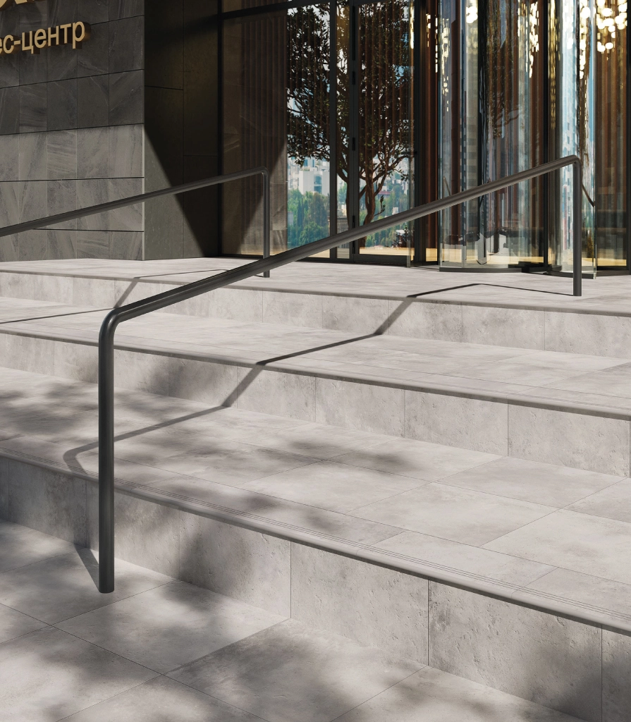 Укладка на стяжку и противоскользящая поверхность грип гарантируют соответствие высоким требованиям безопасности и прочность покрытия. А ступени из гаммы Italon X2, обладающие высокими эксплуатационными качествами, позволяют обустроить входные группы в едином стиле.