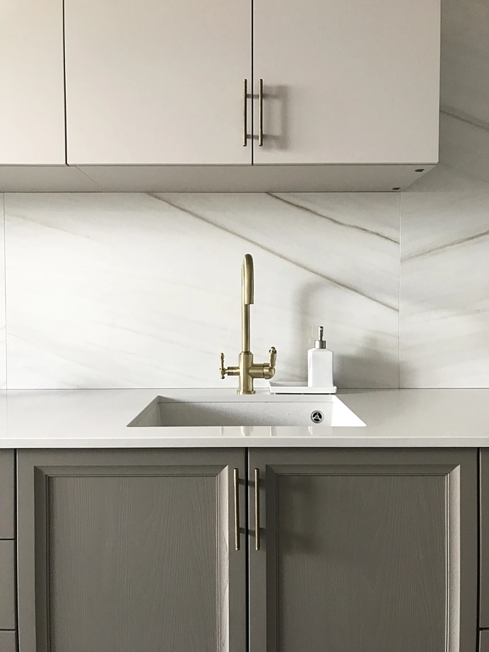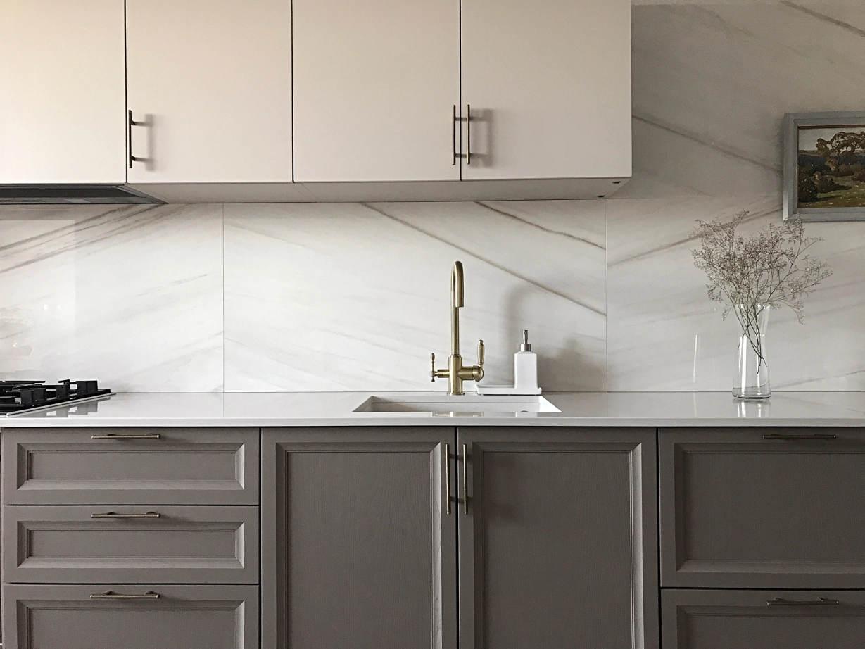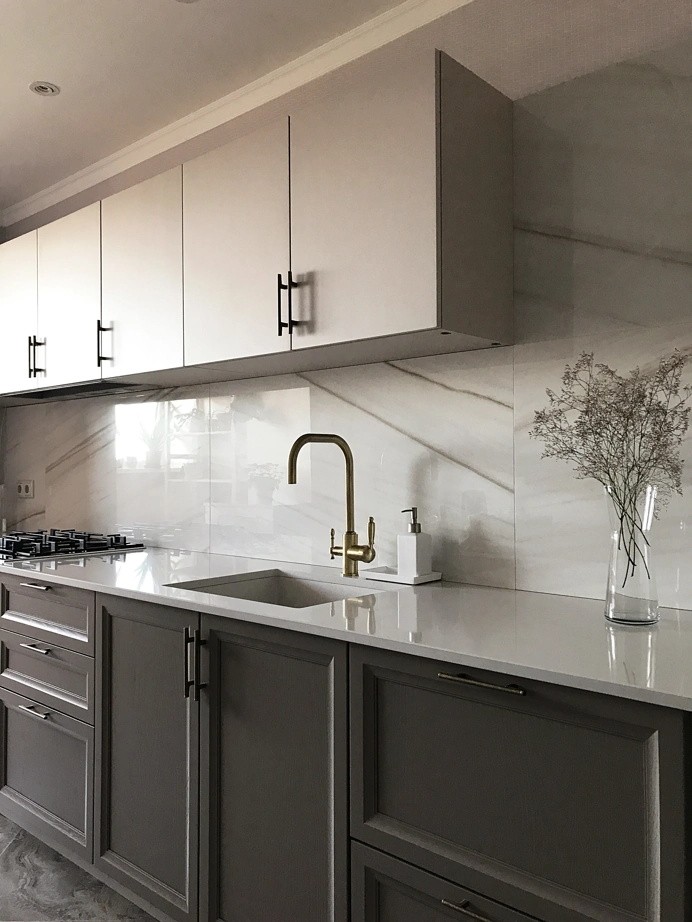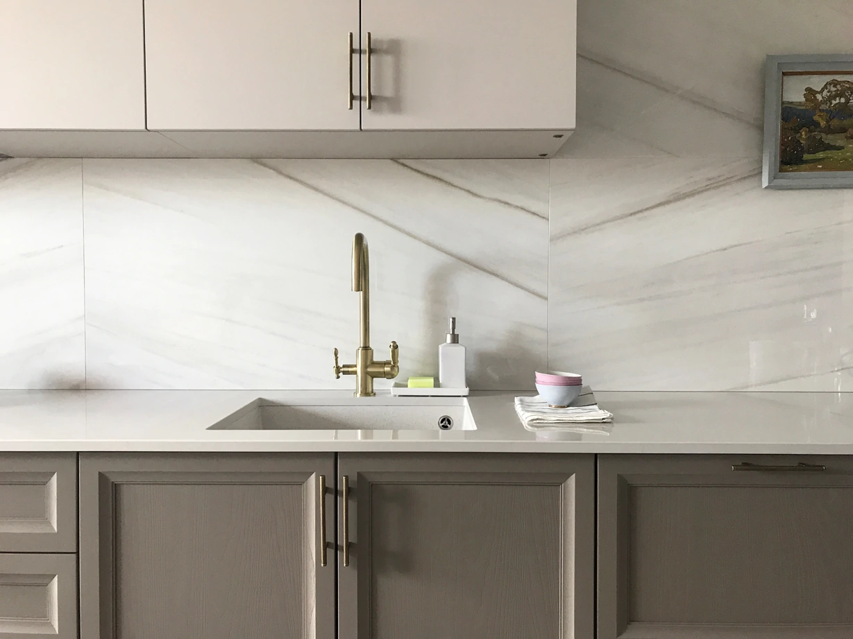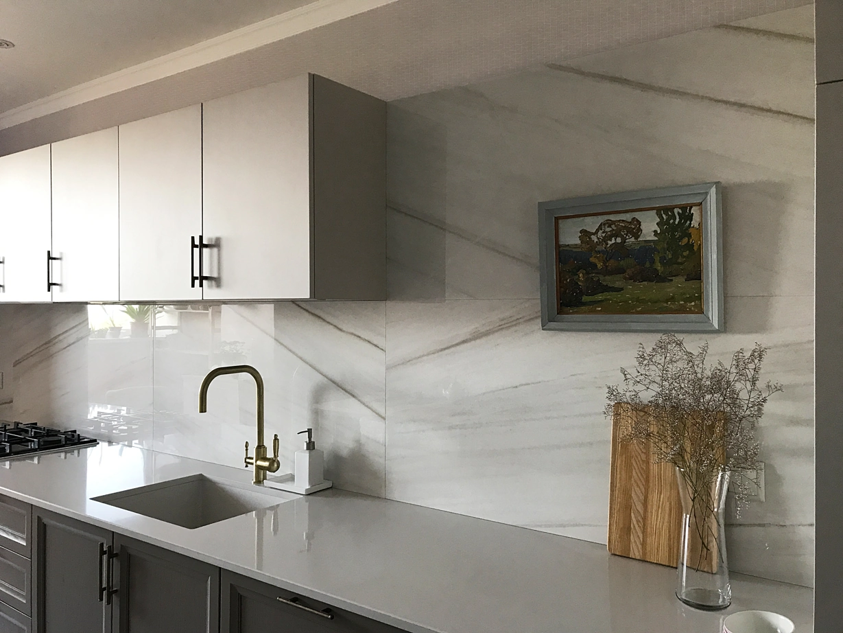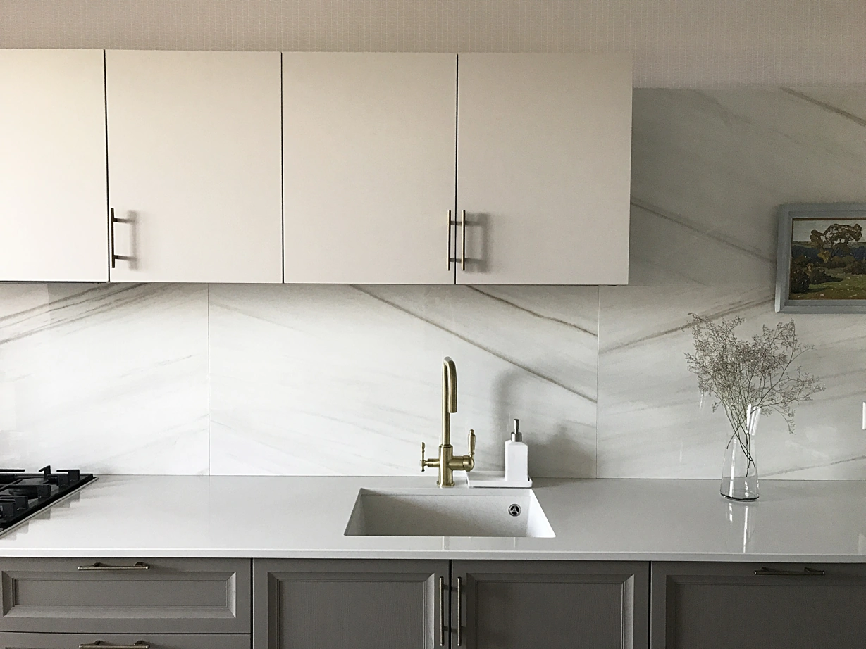 Кухонный фартук – одна из самых заметных деталей любой кухни, способная преобразить вид всего интерьера. Плитка для фартука на кухне должна быть не только эстетичной, но и практичной. В поисках идеальной светлой плитки под мрамор свой выбор дизайнер становила на глянцевом керамограните Charme Extra Lasa в крупном формате 60x120 lux. Светлый кухонный фартук выглядит стильно, свежо и современно. Это универсальное решение для кухни в любом стиле.